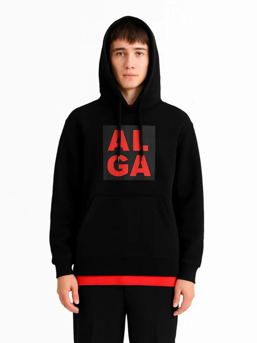 Худи из плотного футера с принтом ALGA на груди. Тактильный акцент становится частью образа, не нарушая общую строгость. Цвет и фактура работают в одной глубине.