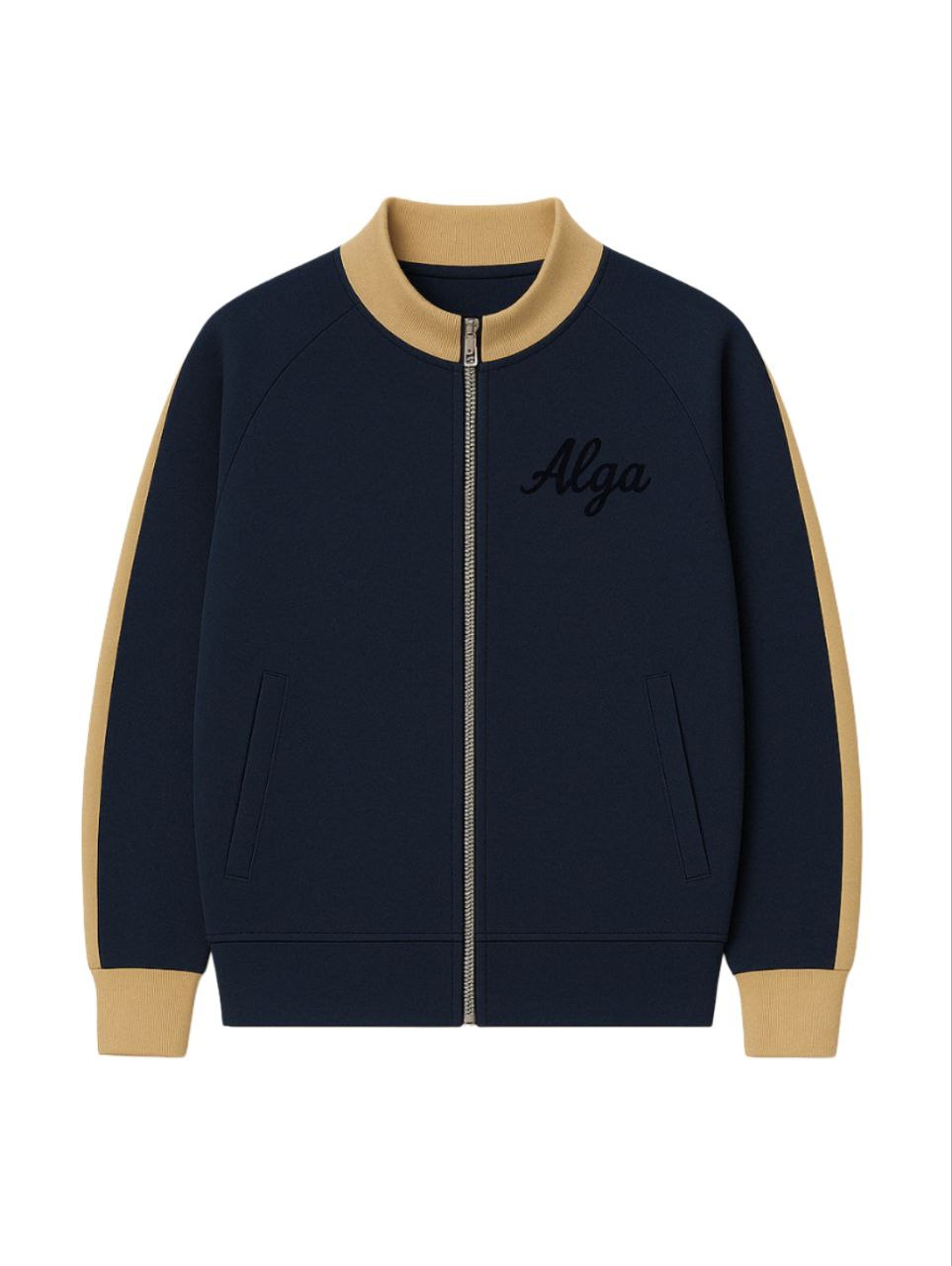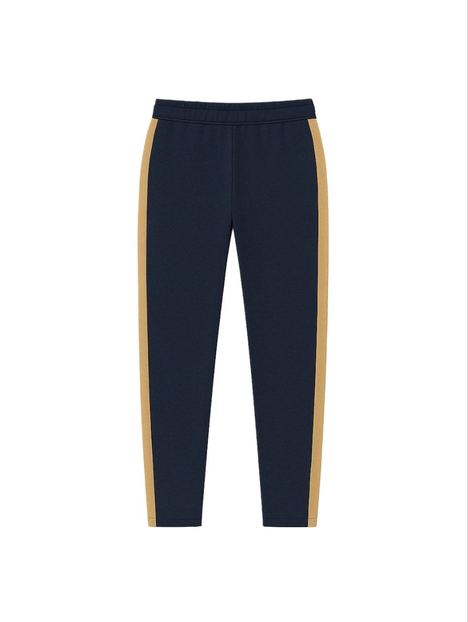Тёмно-синий костюм с бежевыми лампасами — сдержанный, но выразительный. Воротник-бомбер, прямой силуэт и контрастные линии подчёркивают структуру и характер. Универсальный вариант: и для движения, и для паузы между ними.