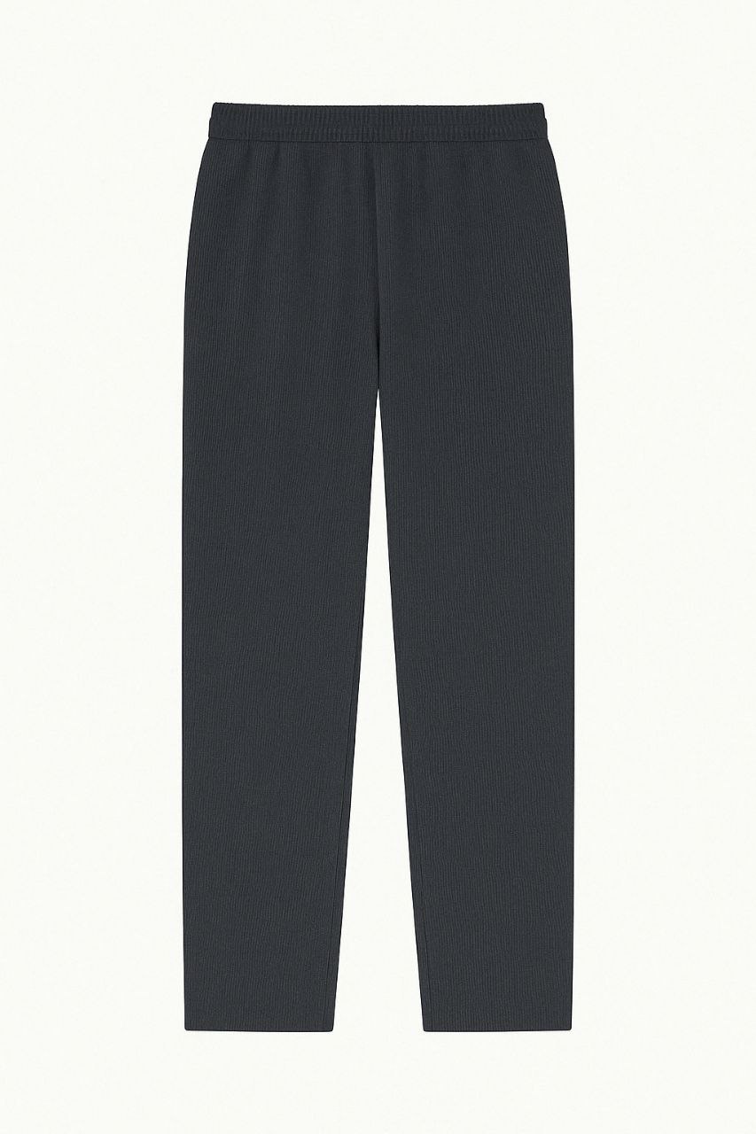Тёмно-серый костюм из плотной рубчиковой ткани оформлен в виде рубашки с воротником и нагрудными карманами. Вместо пуговиц — аккуратные металлические клёпки, подчёркивающие лаконичность дизайна. Прямые брюки дополняют образ, в котором сочетаются строгость, фактура и функциональность.