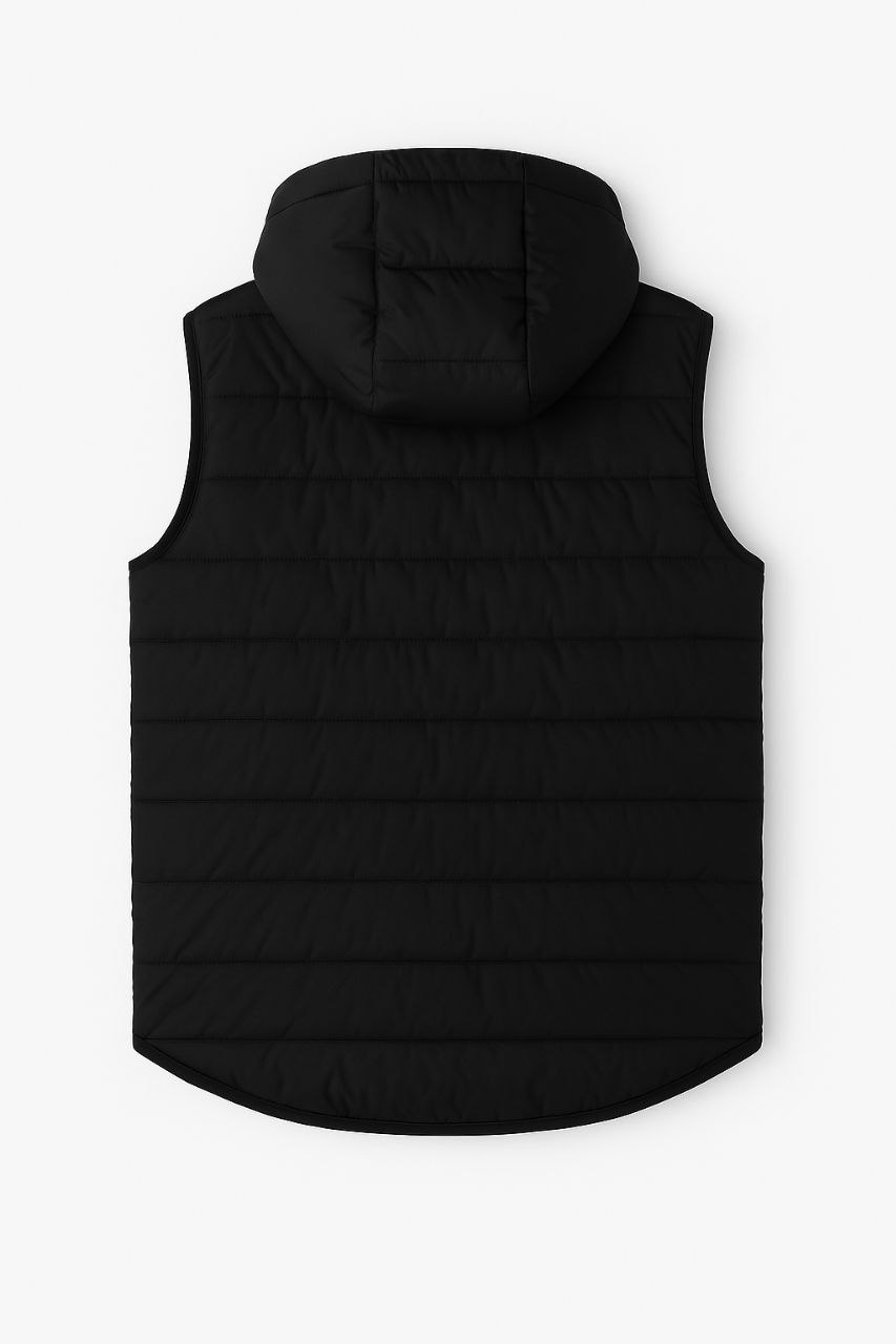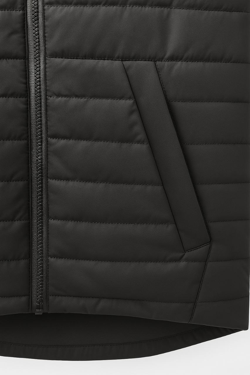 Жилет прямого кроя из плотного материала с утеплённой подкладкой. Глубокий чёрный цвет подчёркивает строгость и универсальность образа.